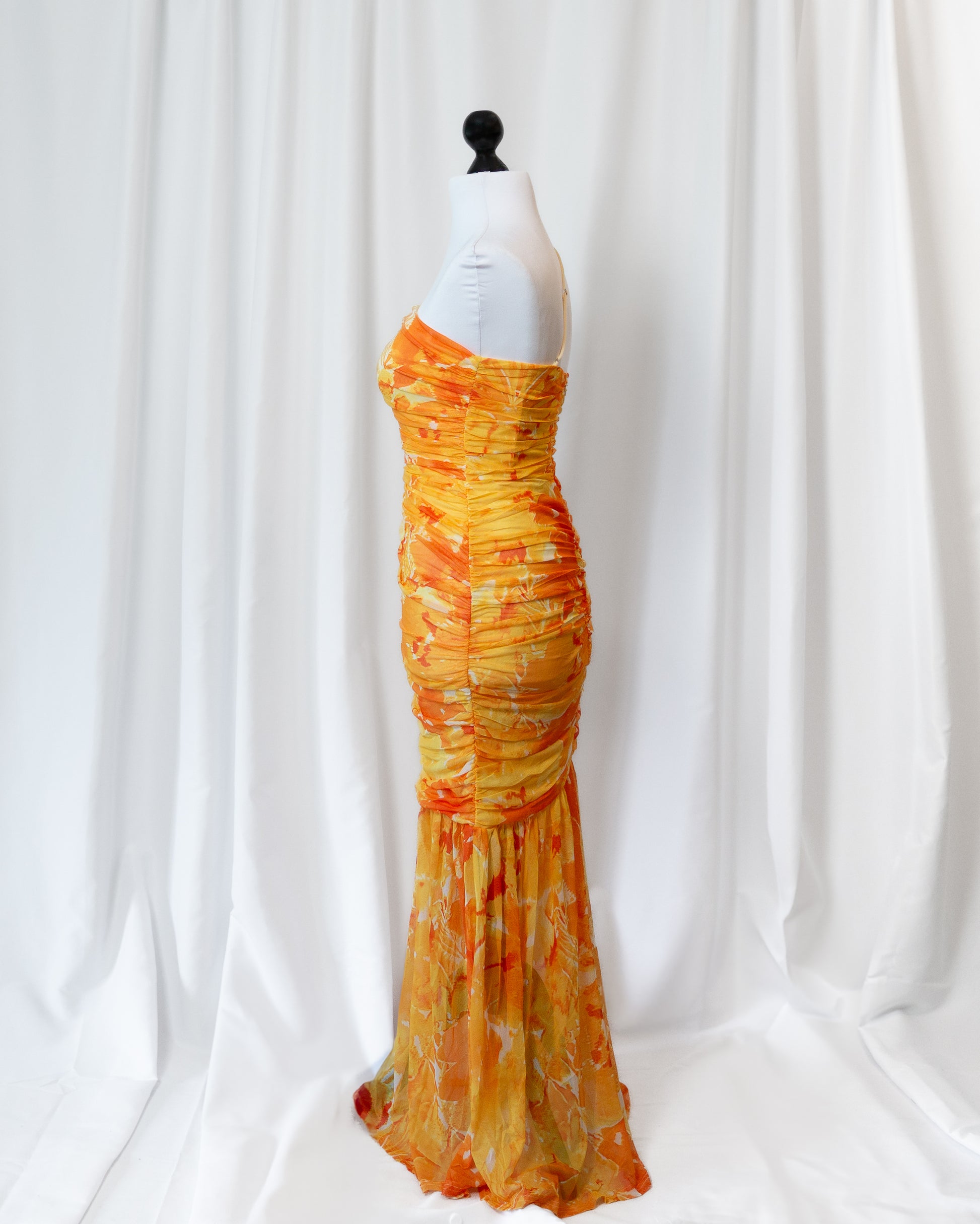 Aurelia drapes soft mesh across a single shoulder, hugging the torso with flattering all-over ruching before cascading to a floor-grazing hem. An adjustable strap fine-tunes the fit, while the stretch mesh moves with you—sultry yet comfortable from aperitif to after-hours.