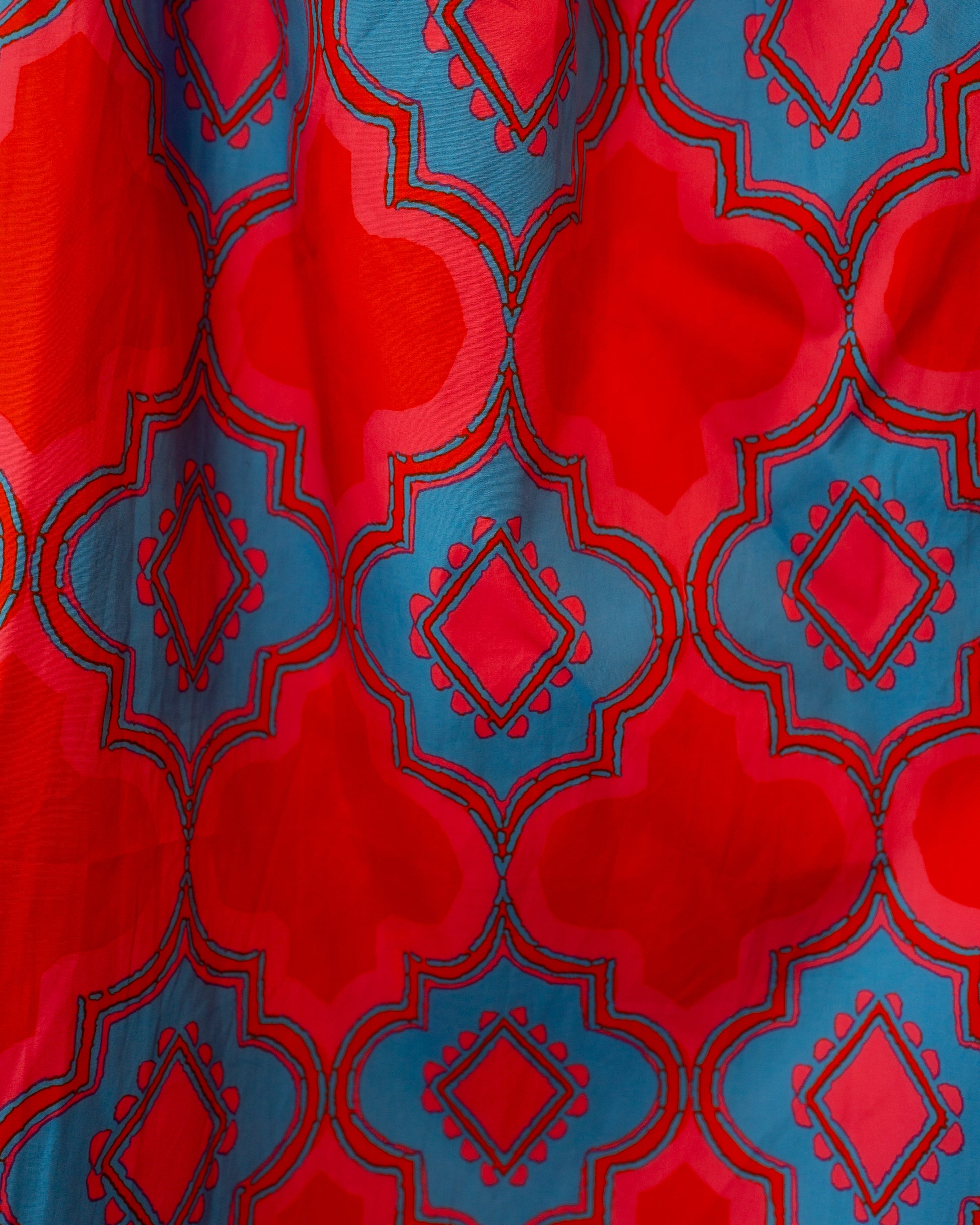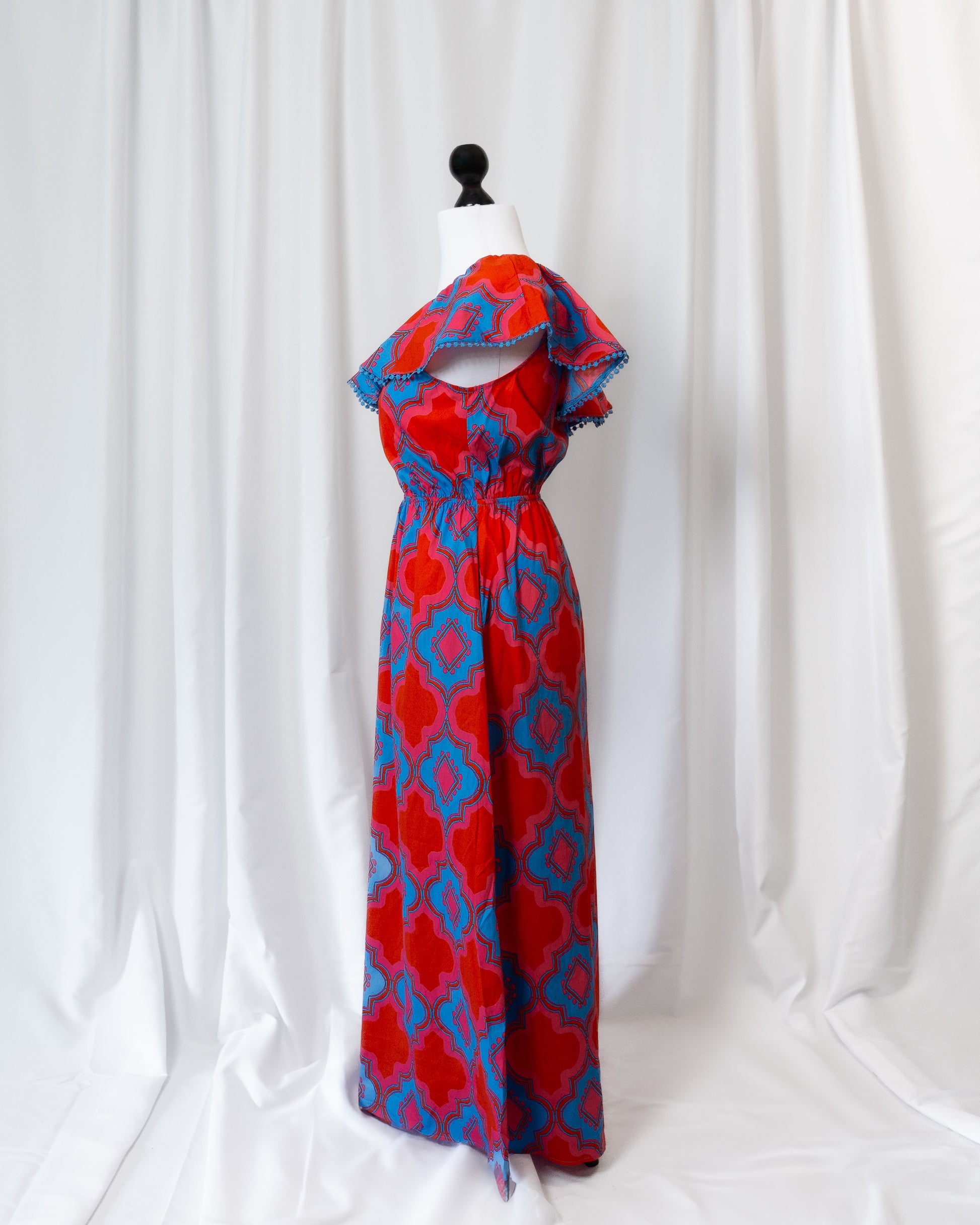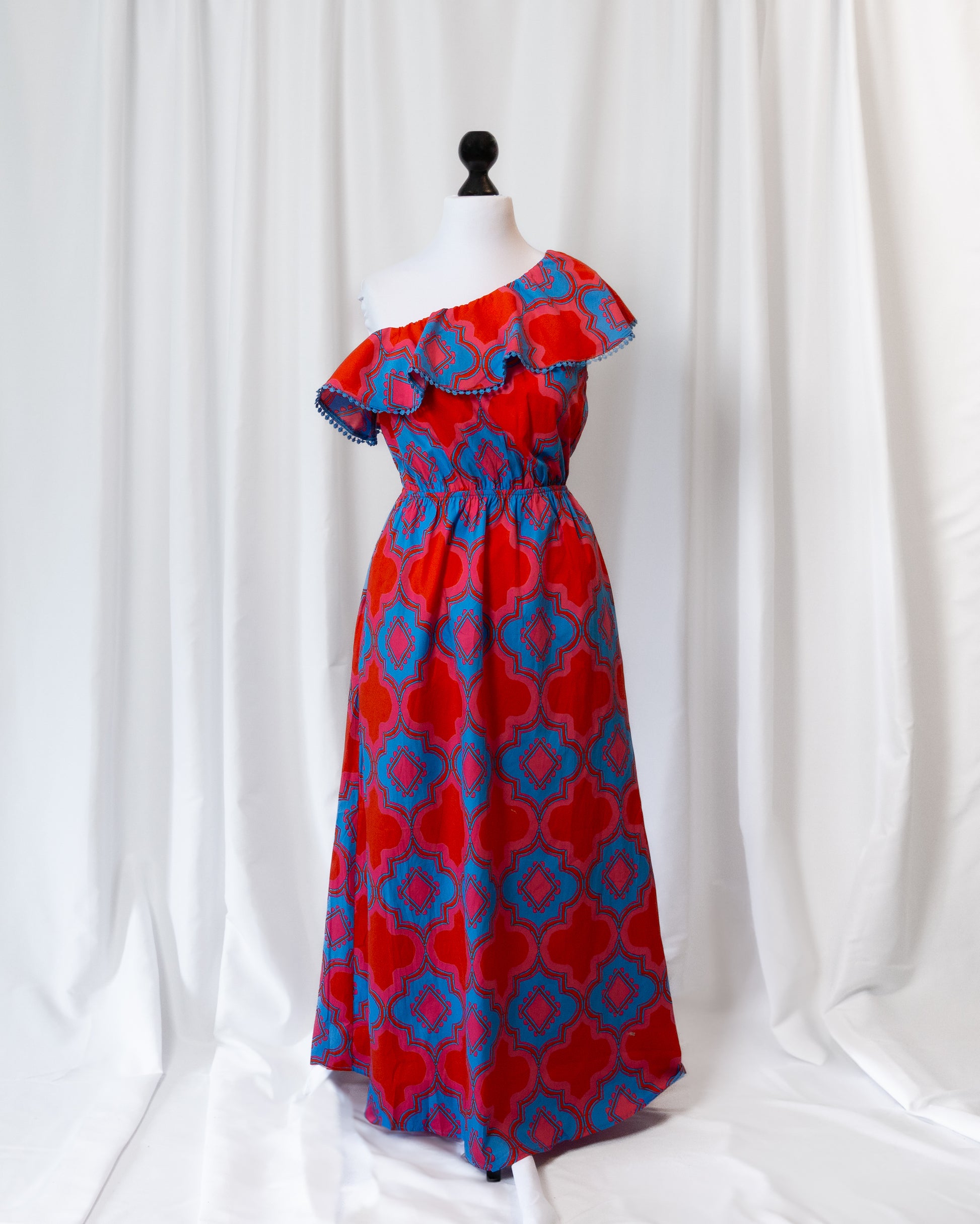 Devany drapes a single ruffled sleeve across the shoulder, balanced by a comfortable elastic-cinched waist and side-seam pockets (yes, pockets). The midi skirt flows with a soft A-line sweep—perfect for dancing or dashing to your next mimosa.