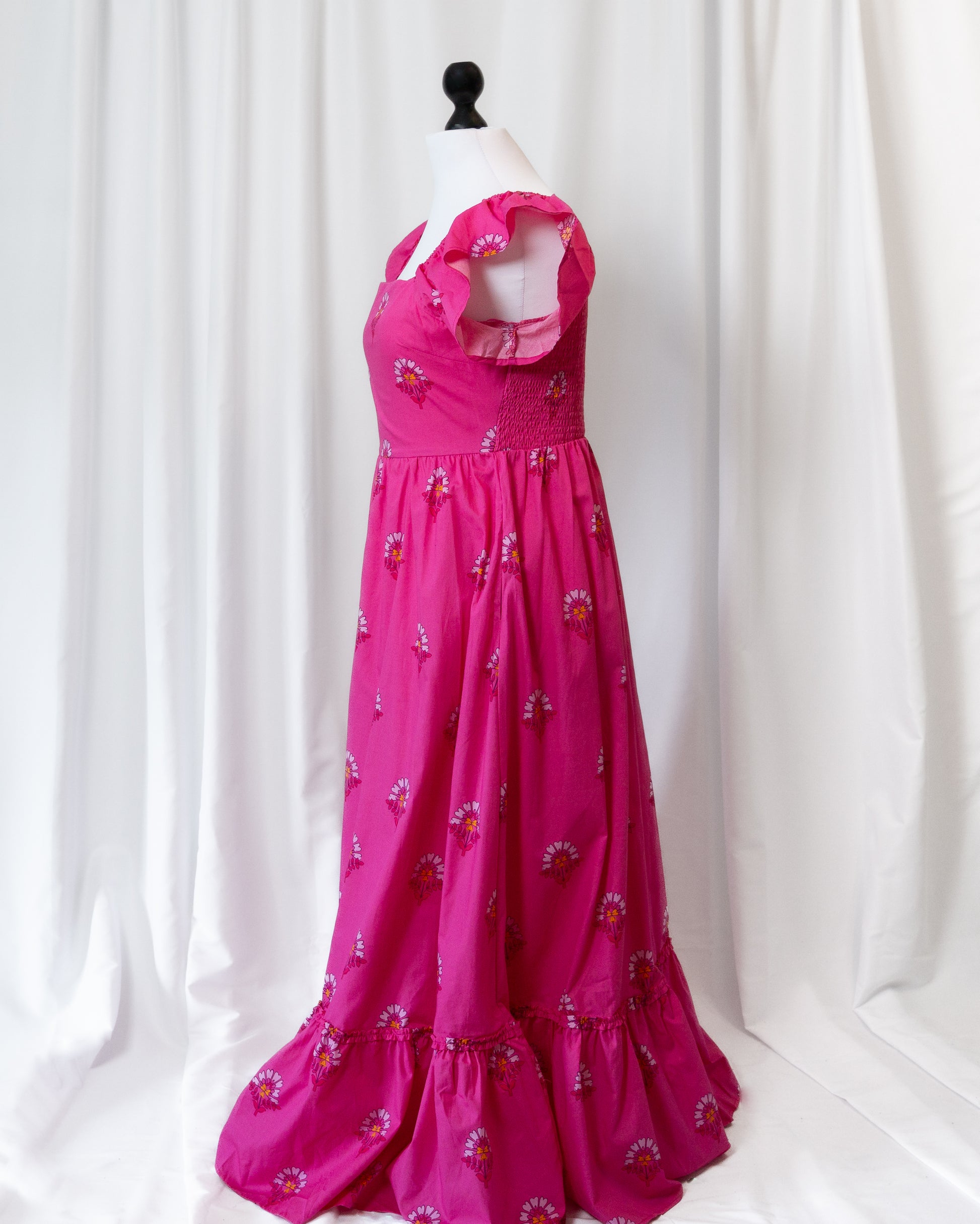 Scarlett’s flutter sleeves frame a gently squared neckline, while a fully smocked back molds to your shape for all-day comfort. Deep pockets hide essentials; the sweeping skirt gives a maxi moment that still feels light as air. Dress it up with wedges or keep it casual with white sneakers.